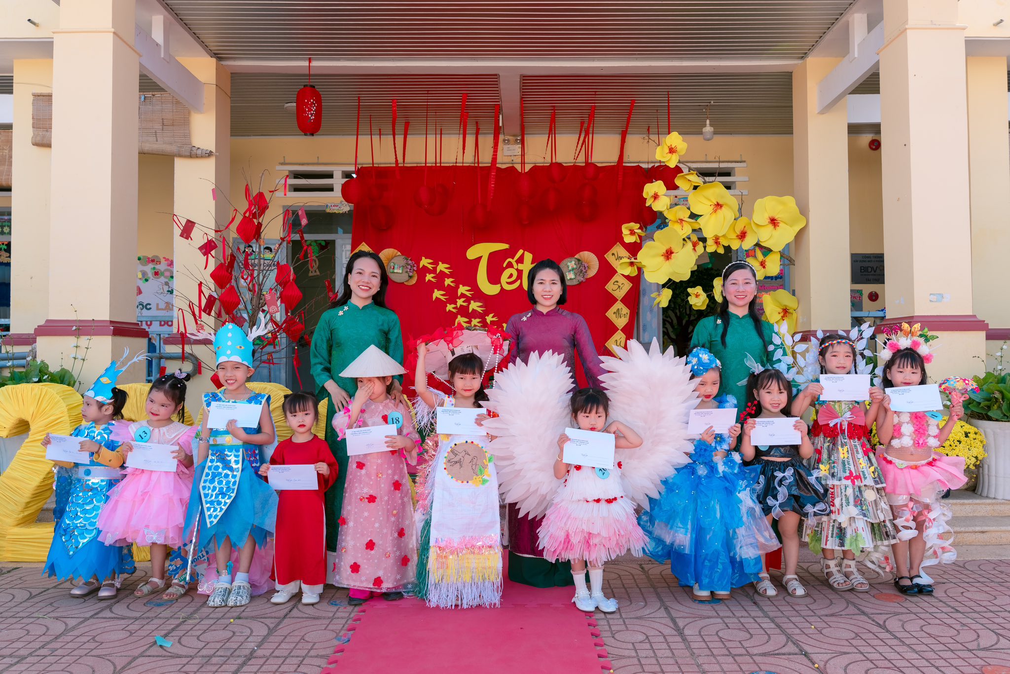 Hình ảnh: Tập thể CB GVNV Nhà trường và các bé được giải trong Hội thi Trình diễn thời trang tái chế ” Nét Xuân”.